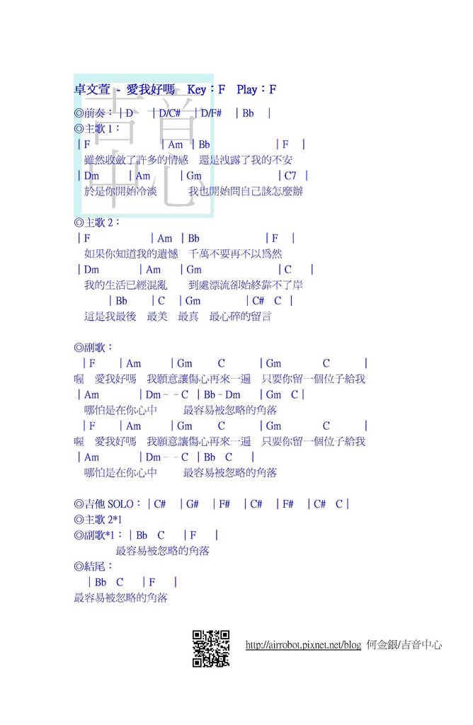 ◎卓文萱-愛我好嗎-吉他譜-和弦譜 by 何金銀/吉音中心◎
