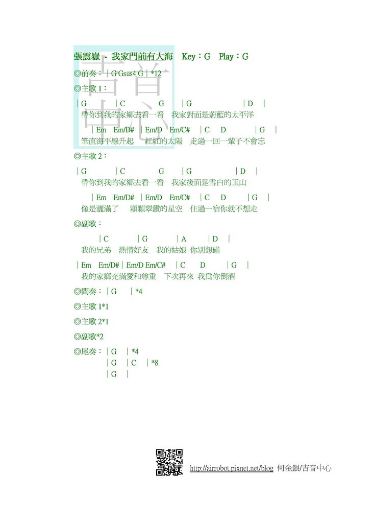 ◎張震嶽-我家門前有大海-吉他譜-和弦譜 by 何金銀/吉音中心◎