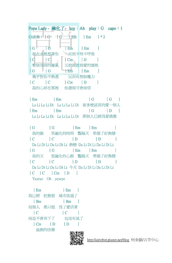 ◎Popu Lady-融化了-吉他譜-和弦譜-solo譜 by 何金銀/吉音中心◎