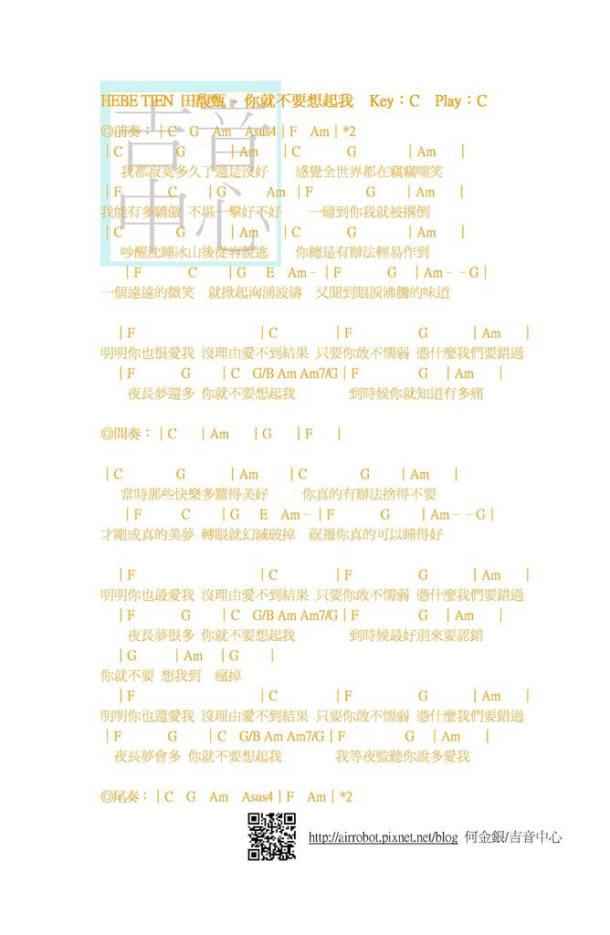 ◎HEBE TIEN 田馥甄-你就不要想起我-和弦譜-吉他譜 by 何金銀/吉音中心◎